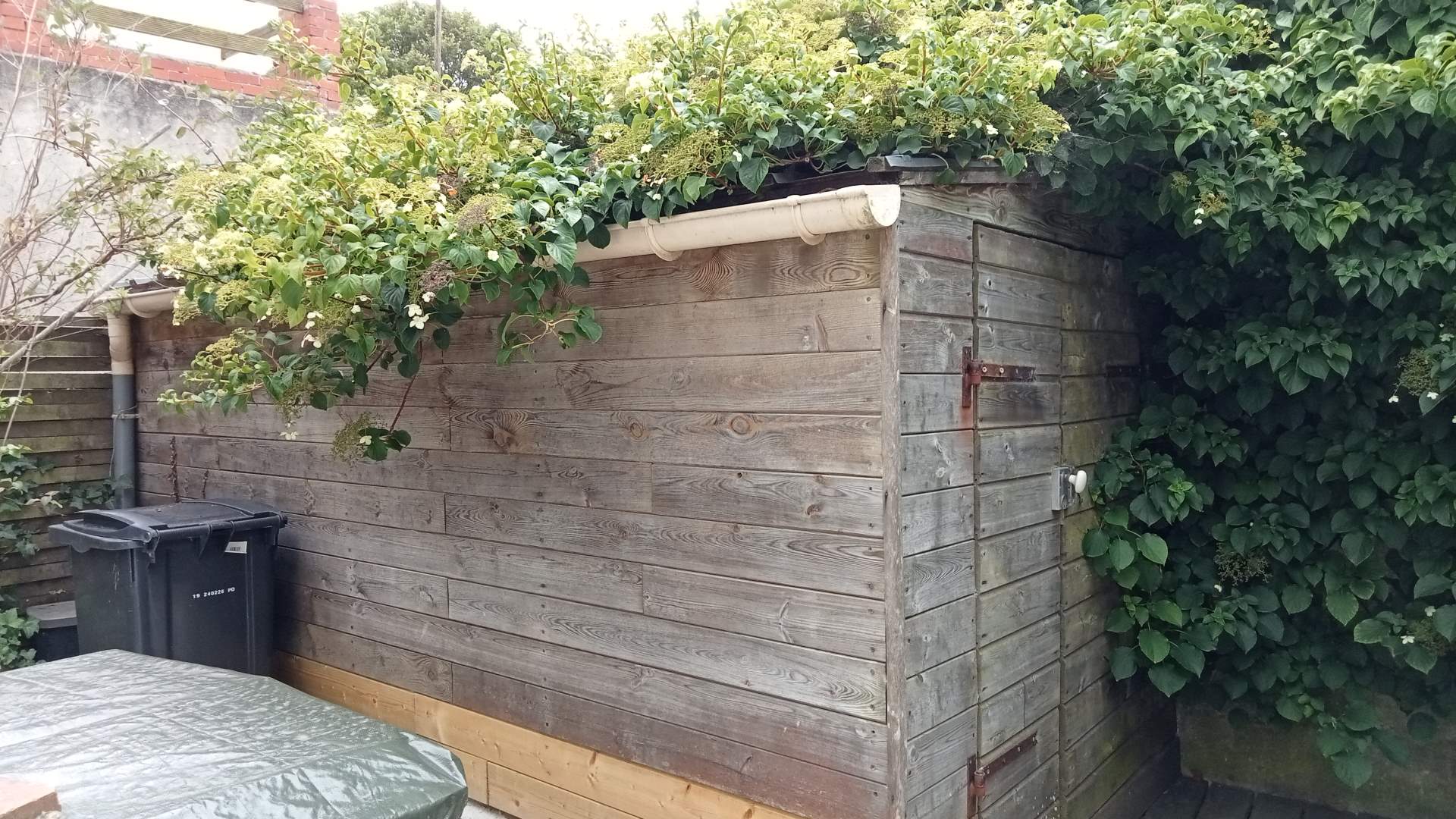 Petit jardinet planté avec terrasse, et batiment de stockage.