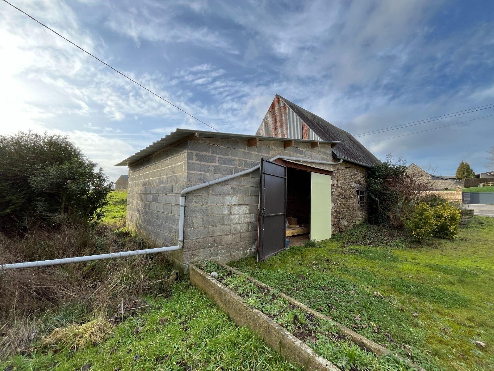 Hangar couvert en tôle sur l'arrière et jardin autour.