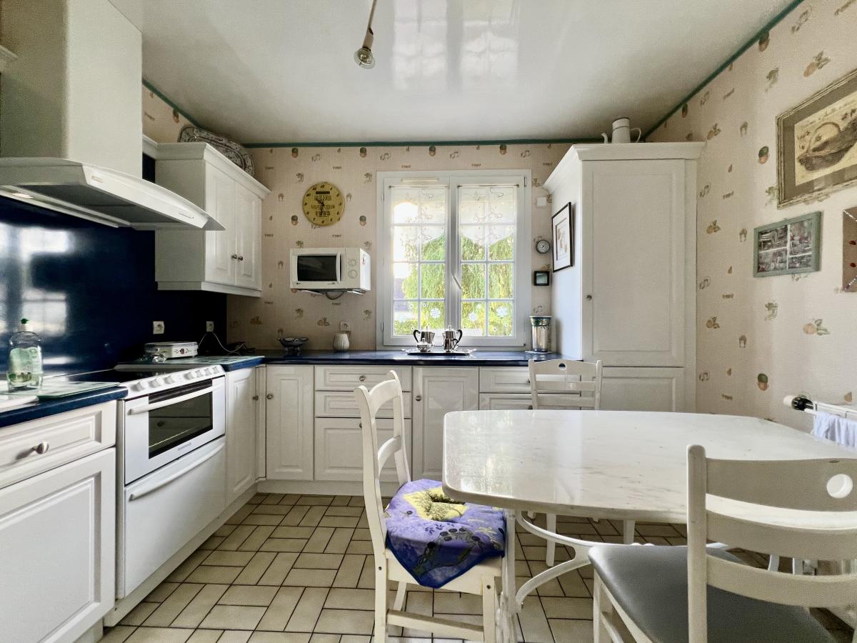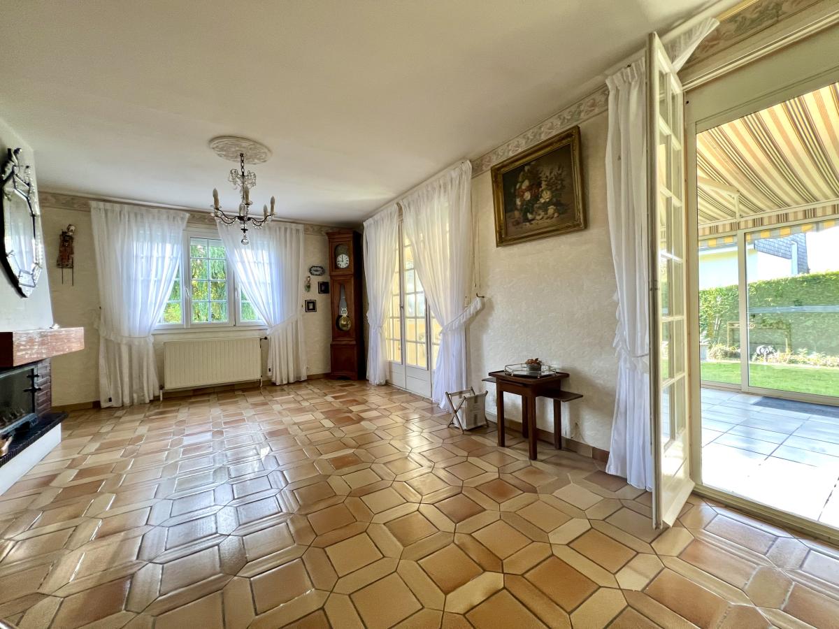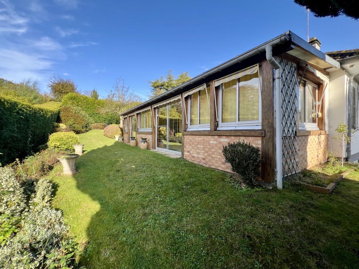 Bieville-Beuville, dans une rue très calme, pavillon de plain pied surélevé de 100 m² comprenant entrée, cuisine, séjour salon, véranda, dégagement, wc, salle d'eau, buanderie, trois chambres dont une avec salle d'eau. Sous-sol complet avec garage. Très beau terrain de 1.200 m² au calme, sans vis à vis et bien exposé.