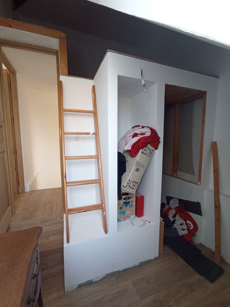 - Au premier étage - accès par l'escalier du bureau : palier, chambre, bureau (ou petite chambre) et salle de bains s'accédant par les deux pièces ;