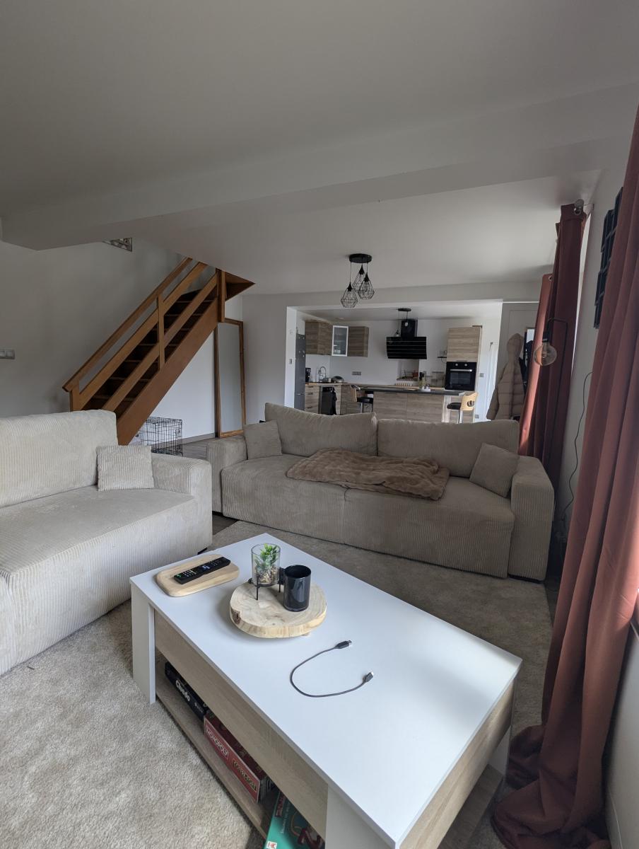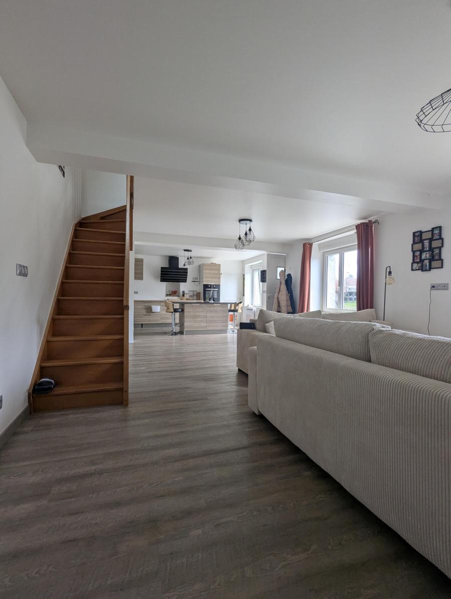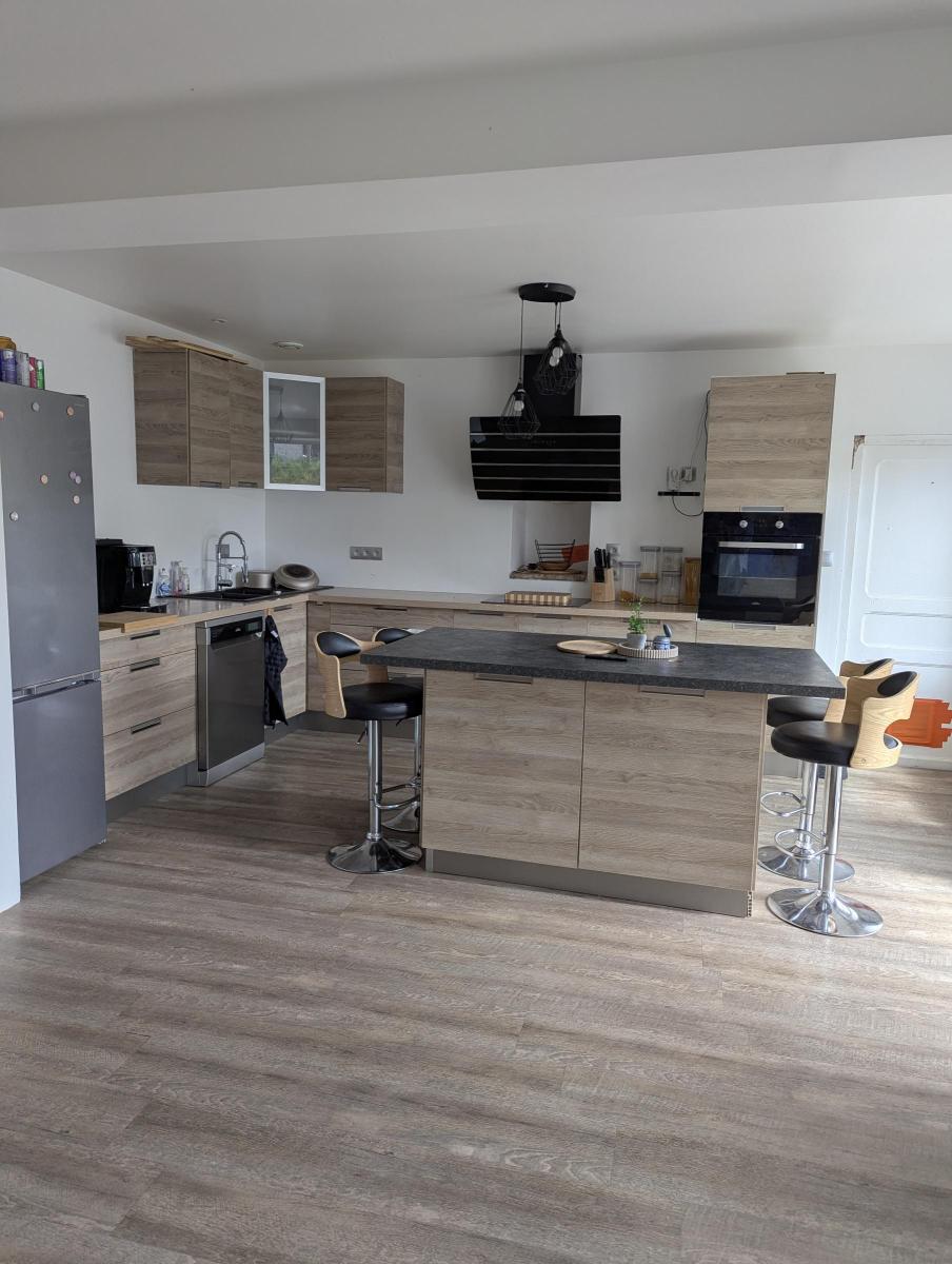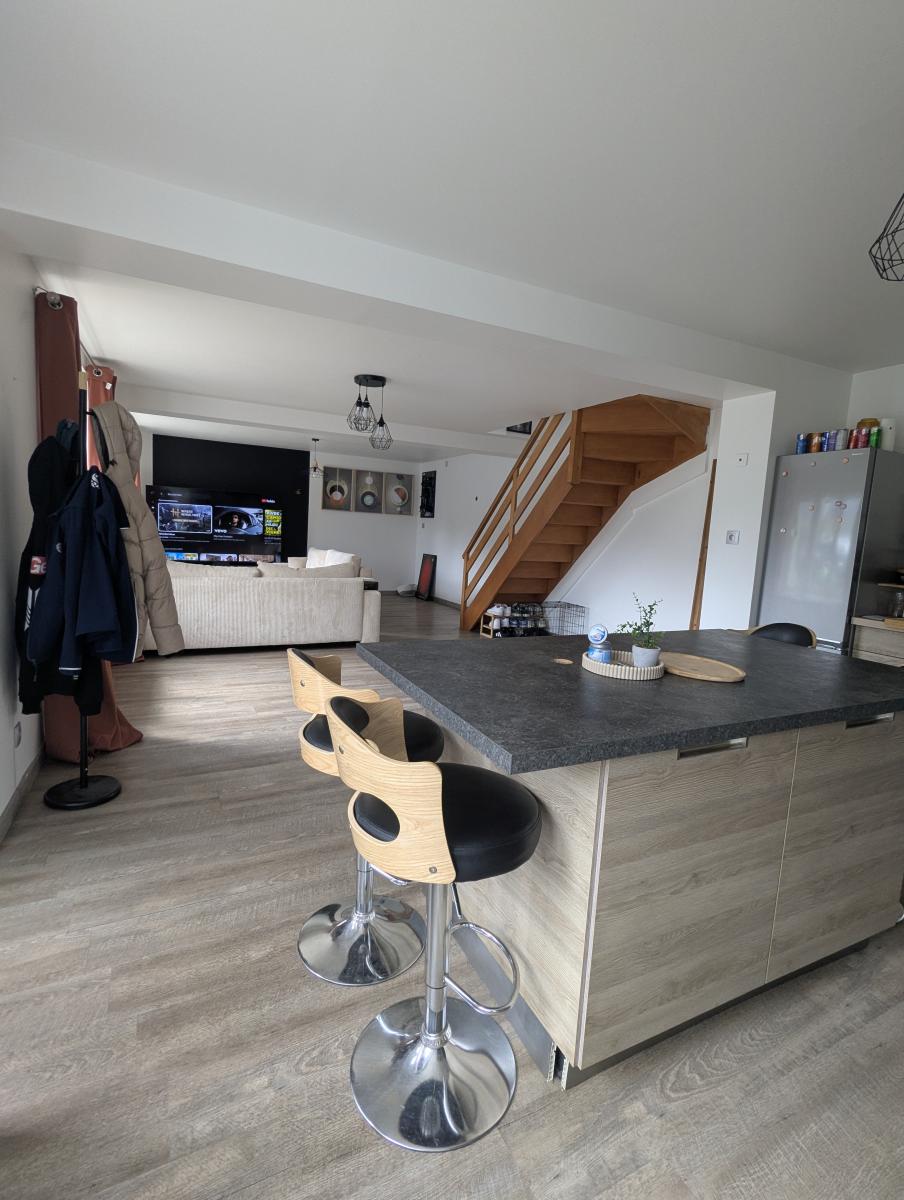 Rez-de-chaussée Cuisine aménagée et équipée ouverte sur un salon lumineux, Une pièce à rénover actuellement utilisée comme buanderie, WC ;