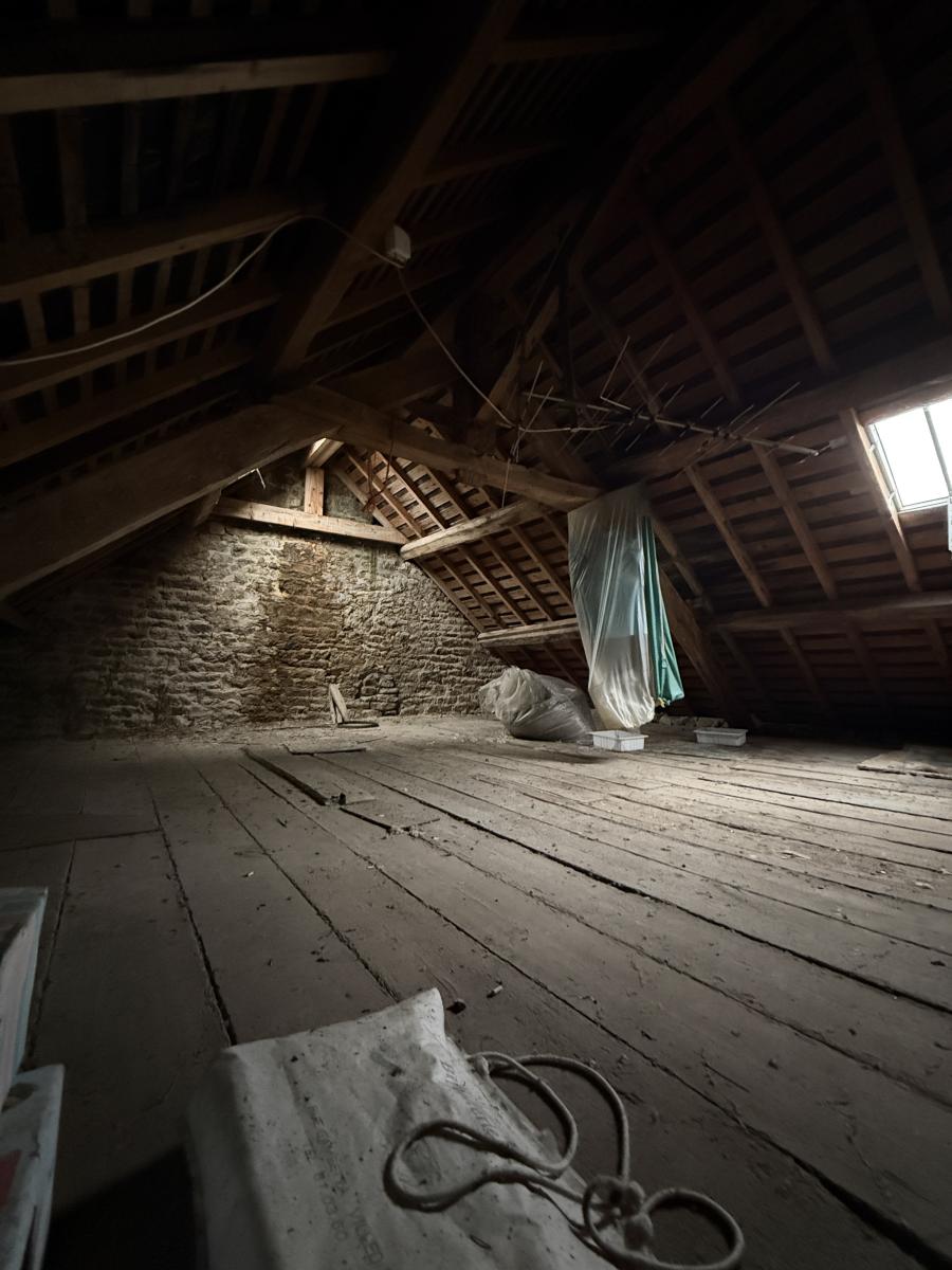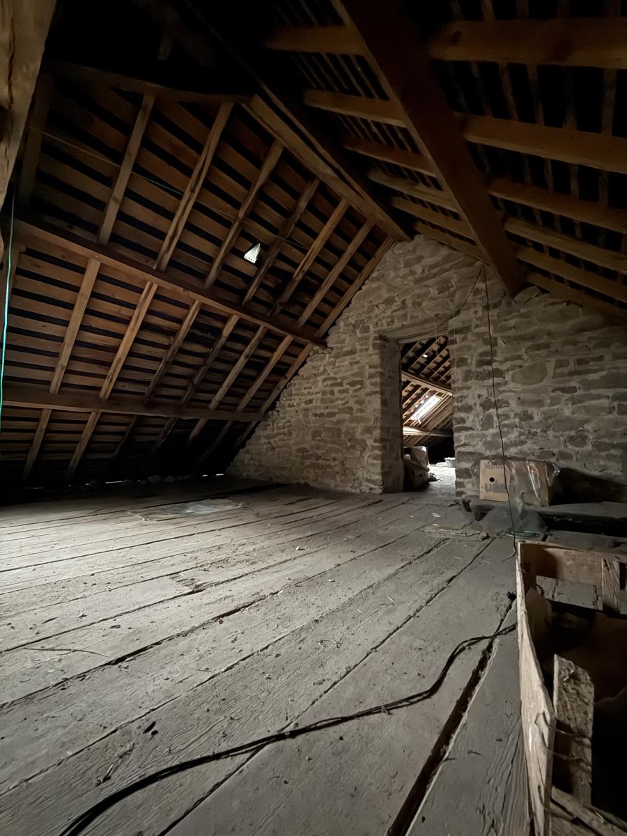 - Au rez de chaussée, pièce de vie avec espace cuisine simple, cheminée insert, un salon, une arrière cuisine, un WC.