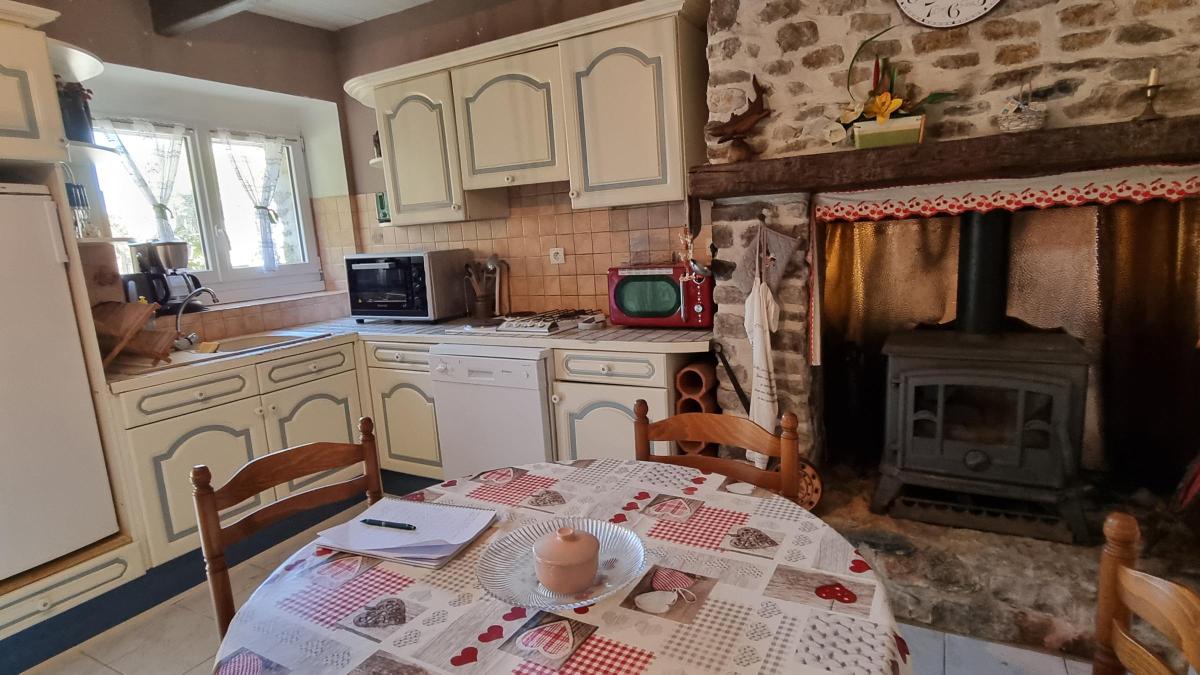 3°) Un gite d'environ 45 m² avec terrasse comprenant : une cuisine aménagée et équipée ouverte sur le séjour (poêle), une chambre, salle d'eau avec wc.
