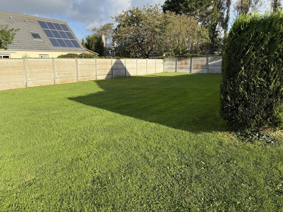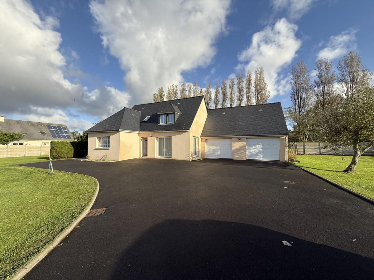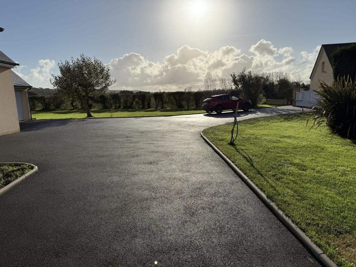 Jardin clos autour avec vaste parking bitumé et portail électrique.
