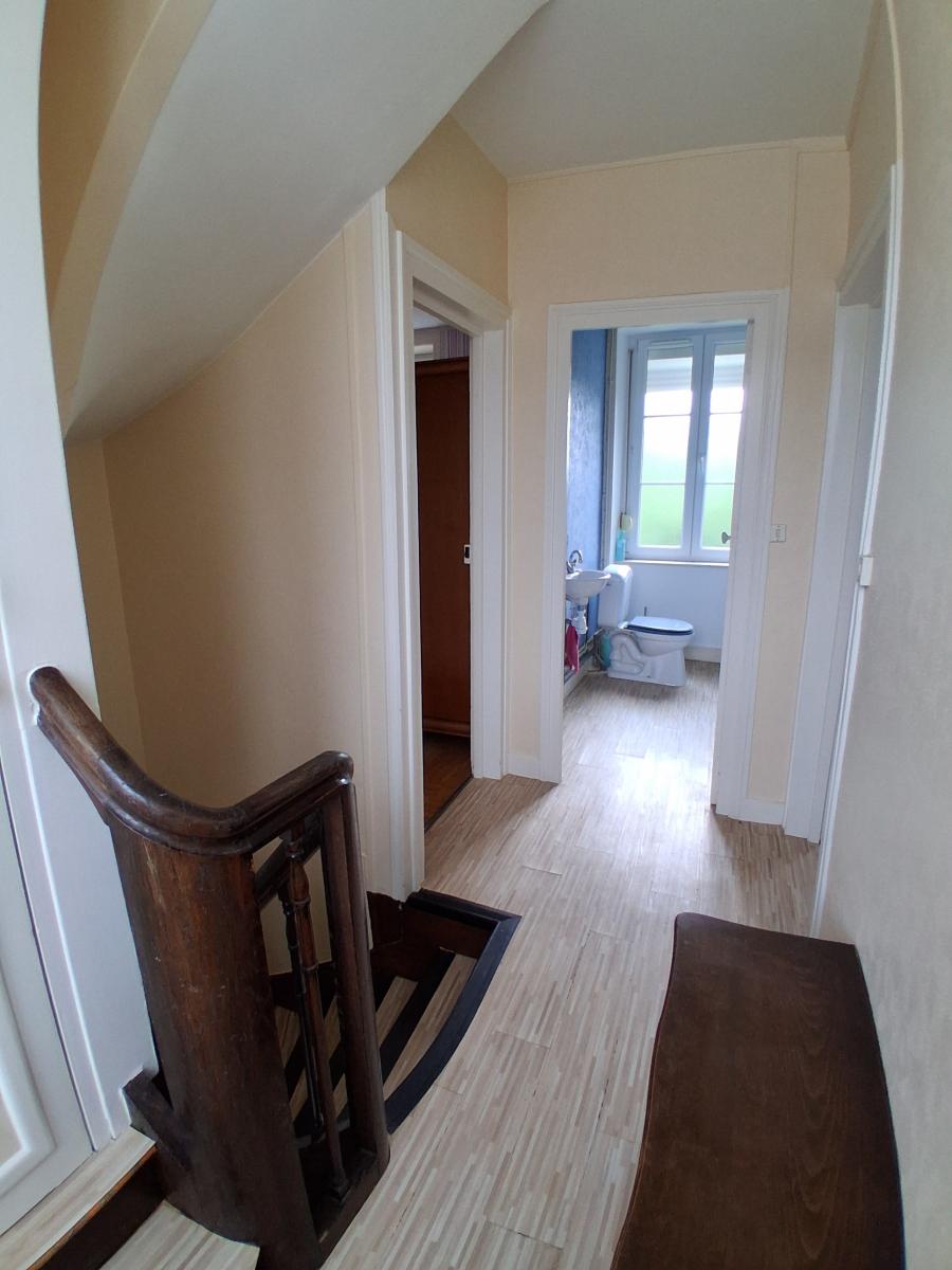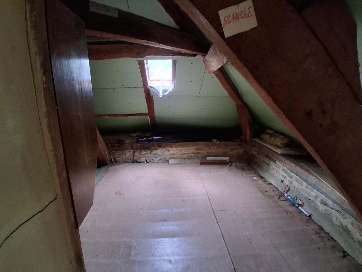 Maison située dans bourg avec commerces et écoles, comprenant : RDC : entrée - cuisine - arrière cuisine - séjour ; Etage : palier - deux chambres dont une avec salle d'eau - Cabinet de toilette avec WC - Grenier au dessus pouvant être aménagé. Cave en sous-sol. Chaufferie en appentis. Garage. Cour et jardin d'agrément. L'ensemble pour 2335 m². Tout à l'égout. Menuiseries PVC.