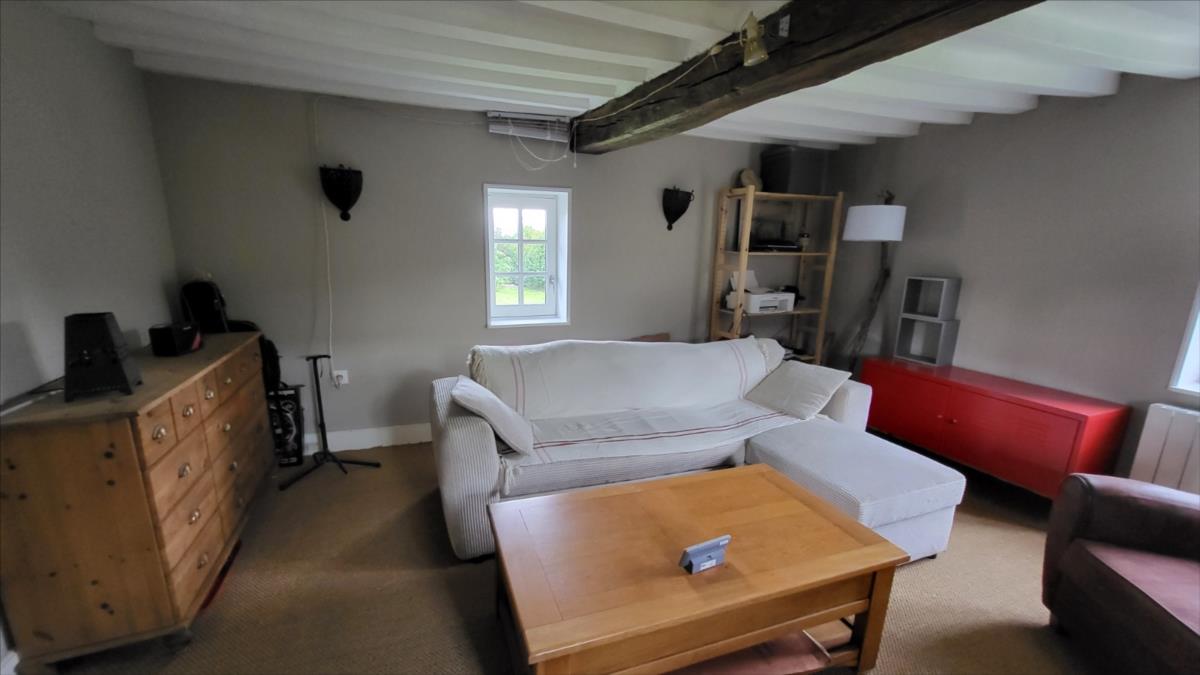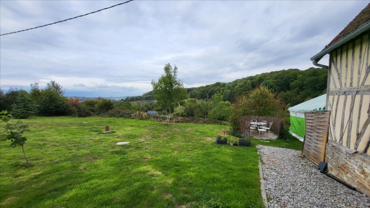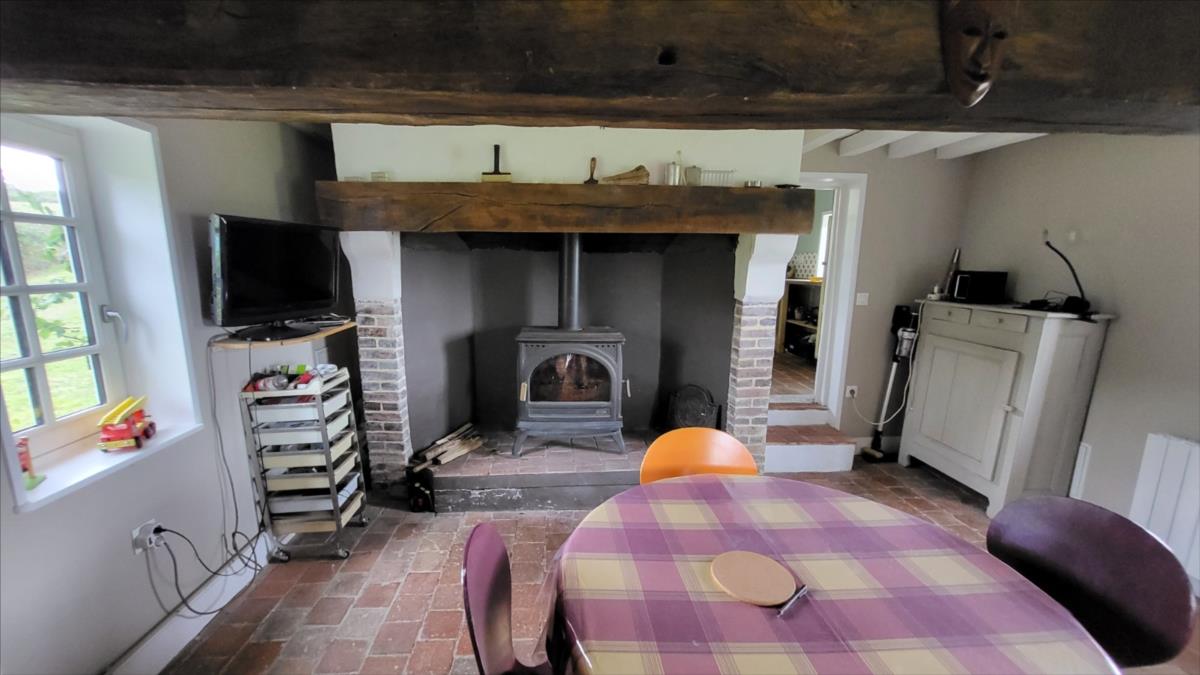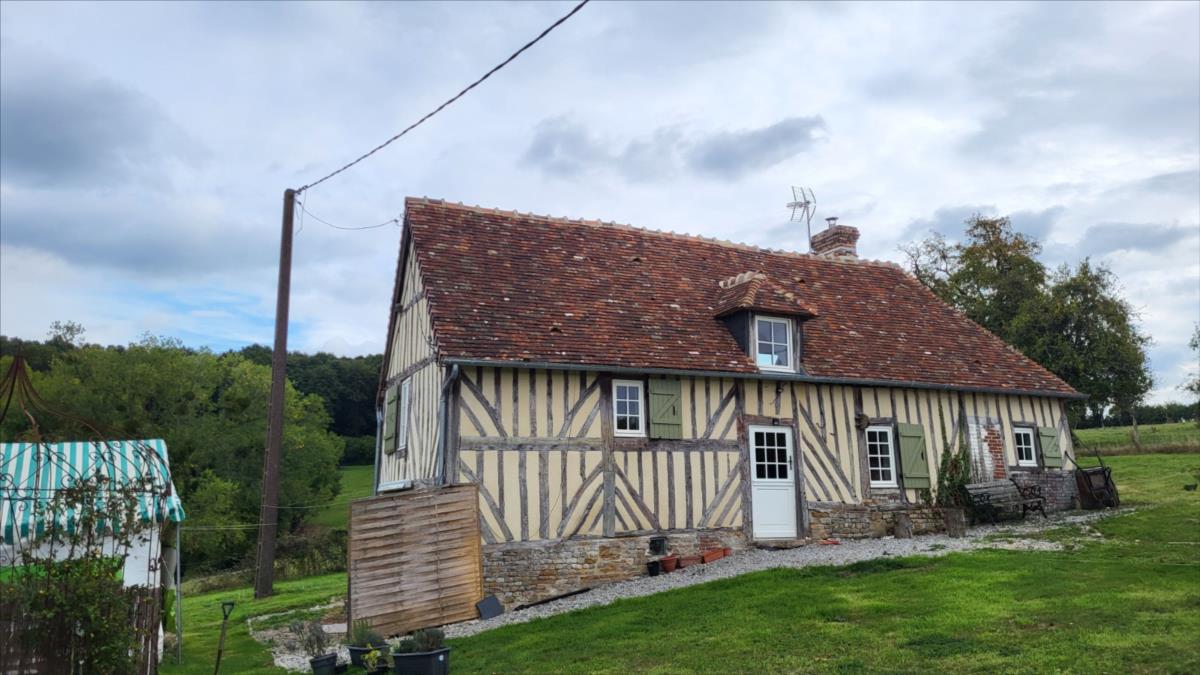 Surplombant les collines du Pays d'Auge, avec une vue magnifique, fermette en colombage rénovée avec goût sur 1706 m² comprenant : salle à manger avec cheminée équipée d'un poêle et tomettes au sol, cuisine aménagée et équipée avec tomettes au sol, wc avec lave-mains avec tomettes au sol, salon ; au 1er étage :une chambre avec charpente apparente et salle de bains privative avec wc et radiateur sèche-serviettes; petit grenier. cave à usage de cuisine d'été; Fenêtres en chêne double vitrage. Isolation des murs et cave. Chauffage par poêle à bois + radiateurs électriques récents.Dépendance à usage de garage-atelier. Terrain avec gloriette en fer forgé avec électricité.