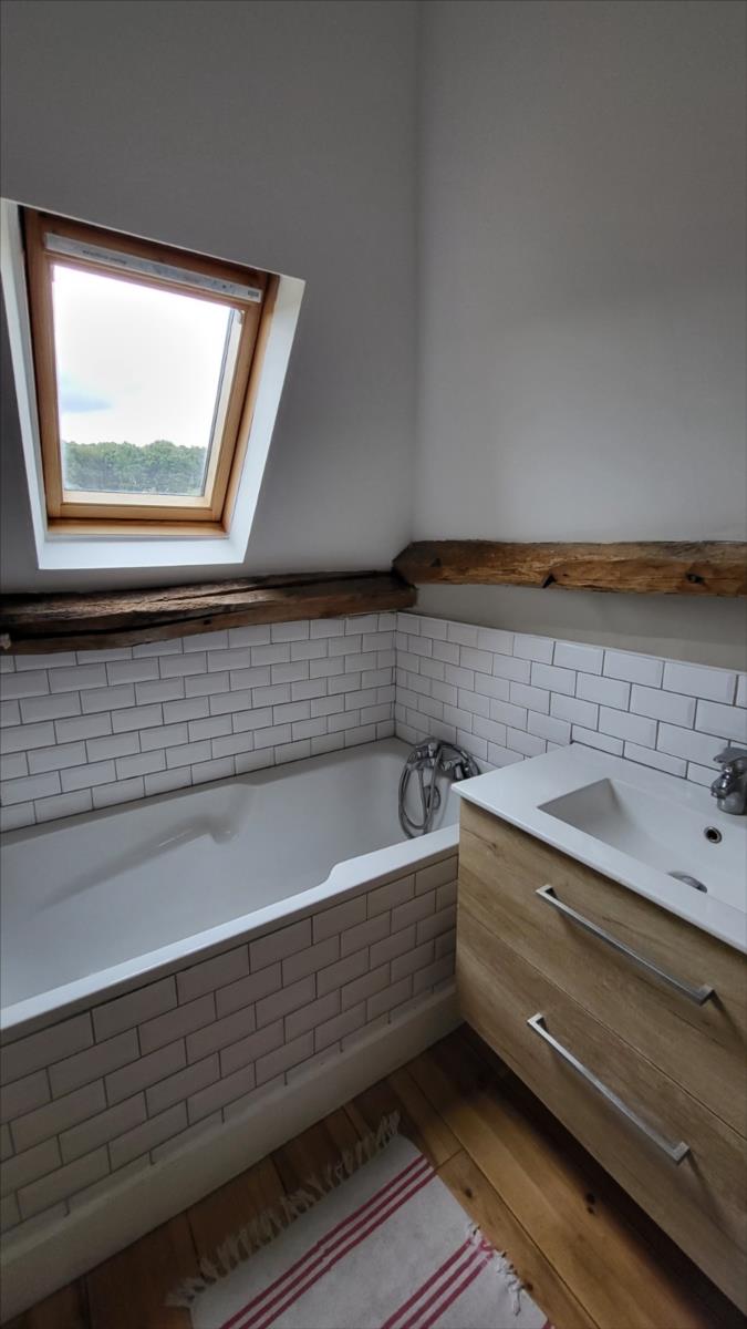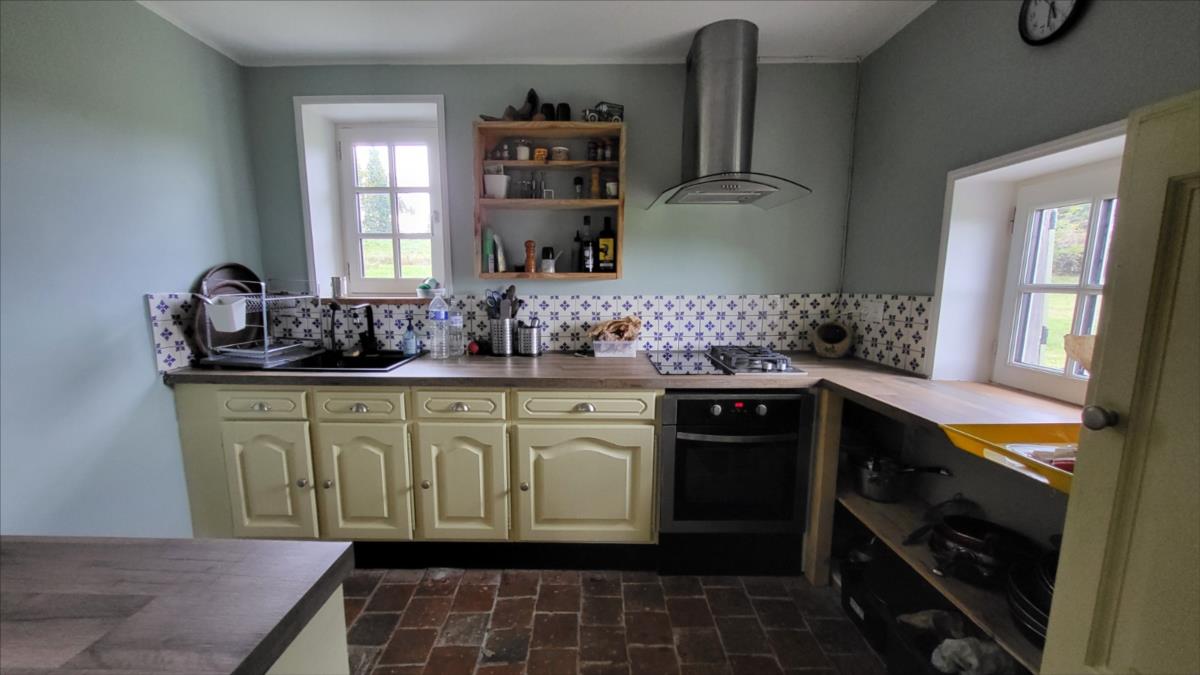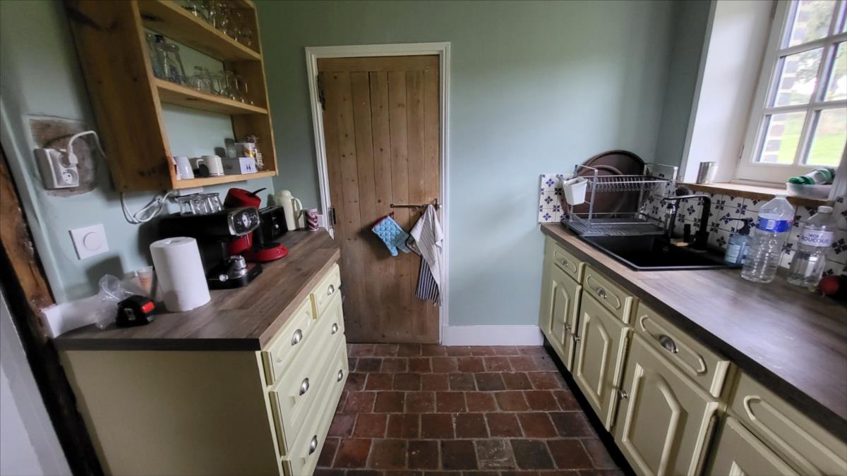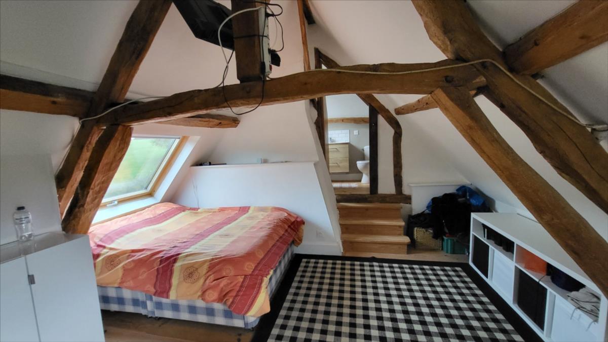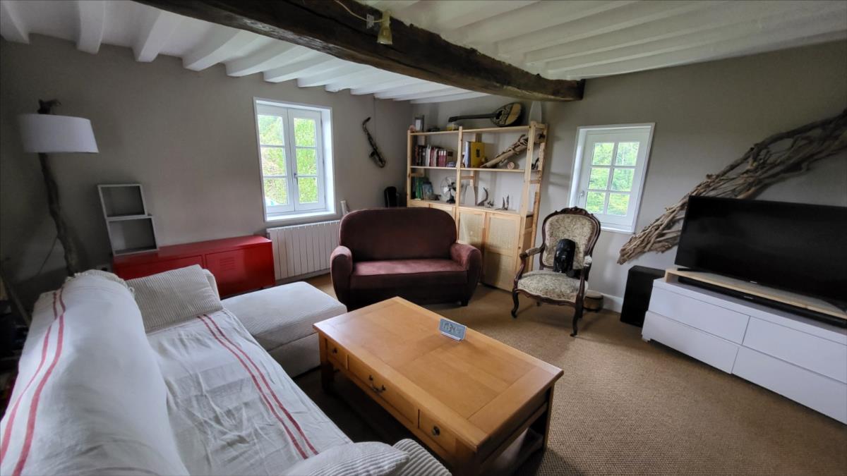 Surplombant les collines du Pays d'Auge, avec une vue magnifique, fermette en colombage rénovée avec goût sur 1706 m² comprenant : salle à manger avec cheminée équipée d'un poêle et tomettes au sol, cuisine aménagée et équipée avec tomettes au sol, wc avec lave-mains avec tomettes au sol, salon ; au 1er étage :une chambre avec charpente apparente et salle de bains privative avec wc et radiateur sèche-serviettes; petit grenier. cave à usage de cuisine d'été; Fenêtres en chêne double vitrage. Isolation des murs et cave. Chauffage par poêle à bois + radiateurs électriques récents.Dépendance à usage de garage-atelier. Terrain avec gloriette en fer forgé avec électricité.