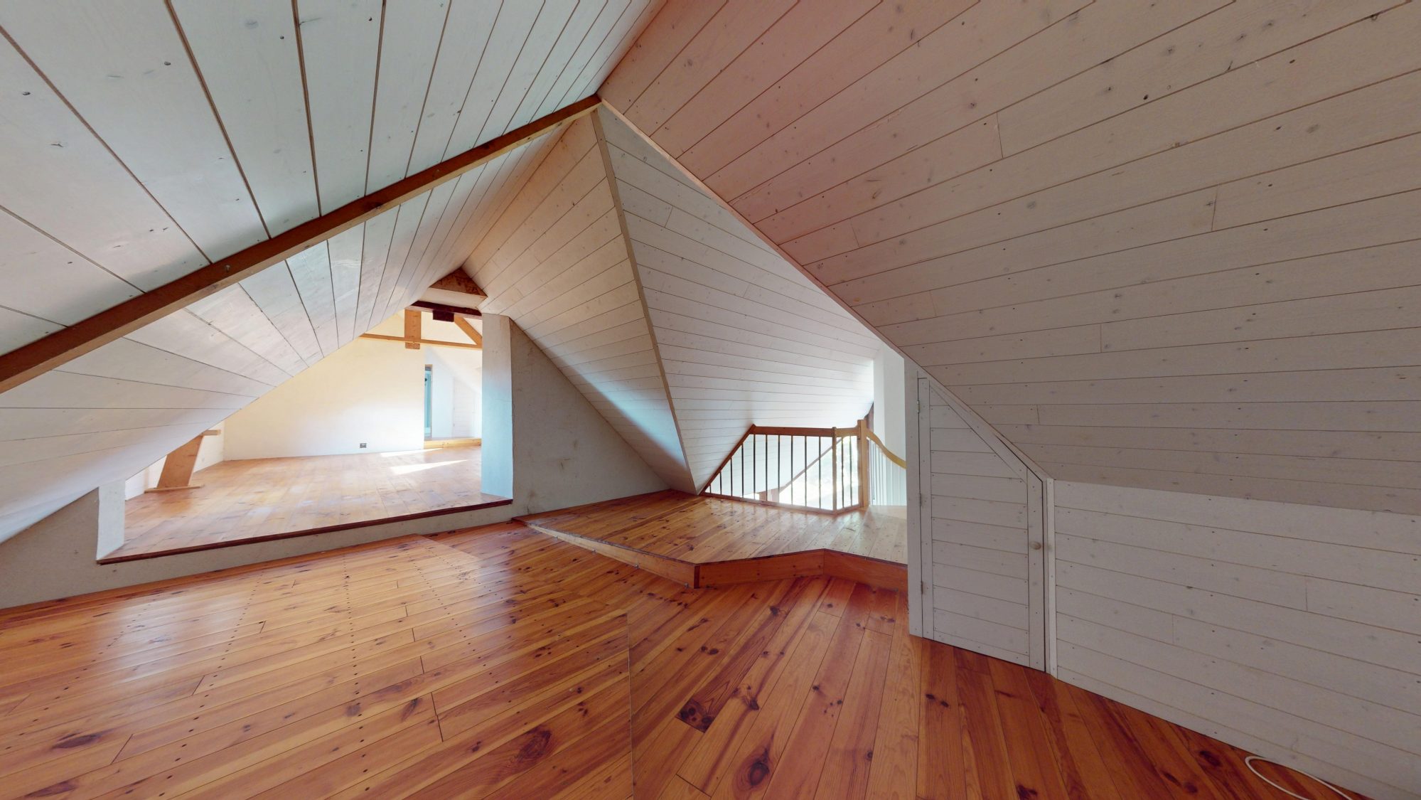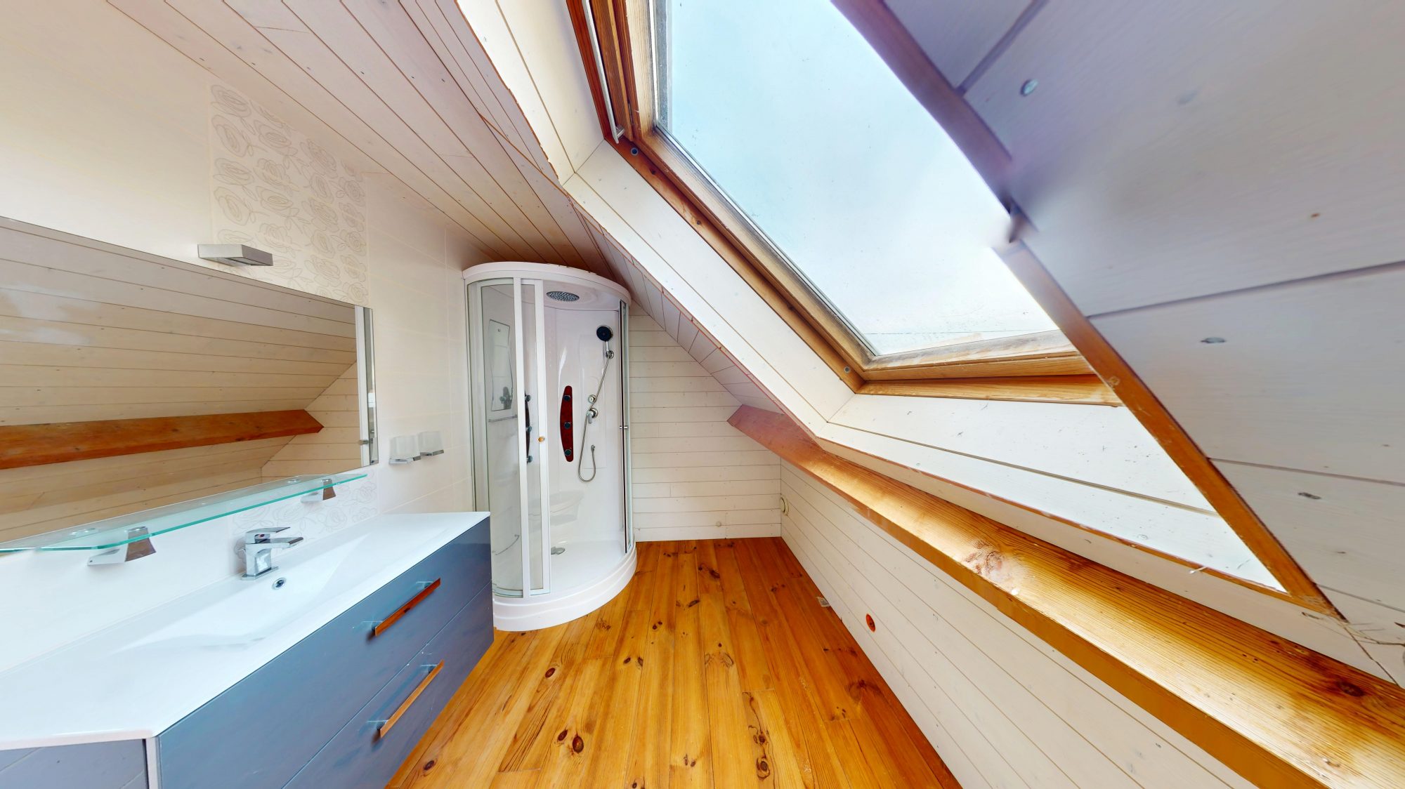 - au rez-de-chaussée : cuisine avec poêle à bois, buanderie, WC avec lavabo, deux chambres dont une avec cheminée insert, salle de bains ;