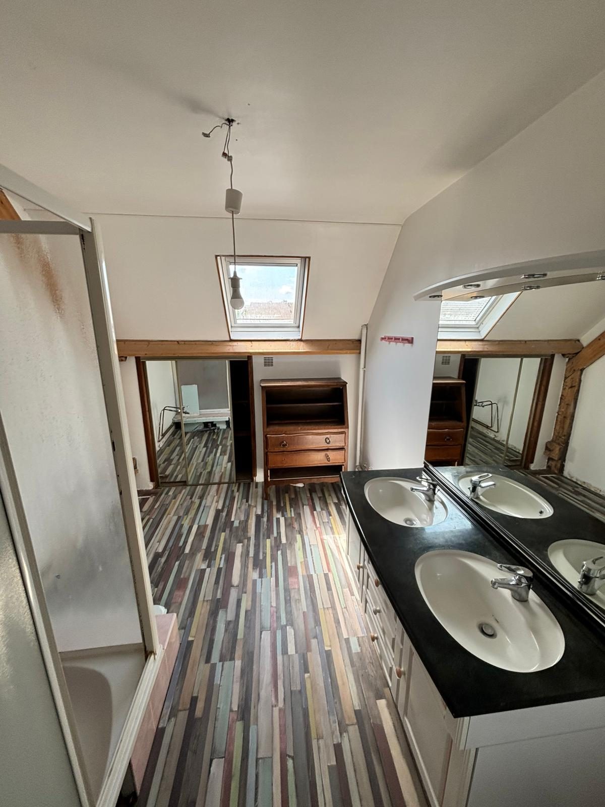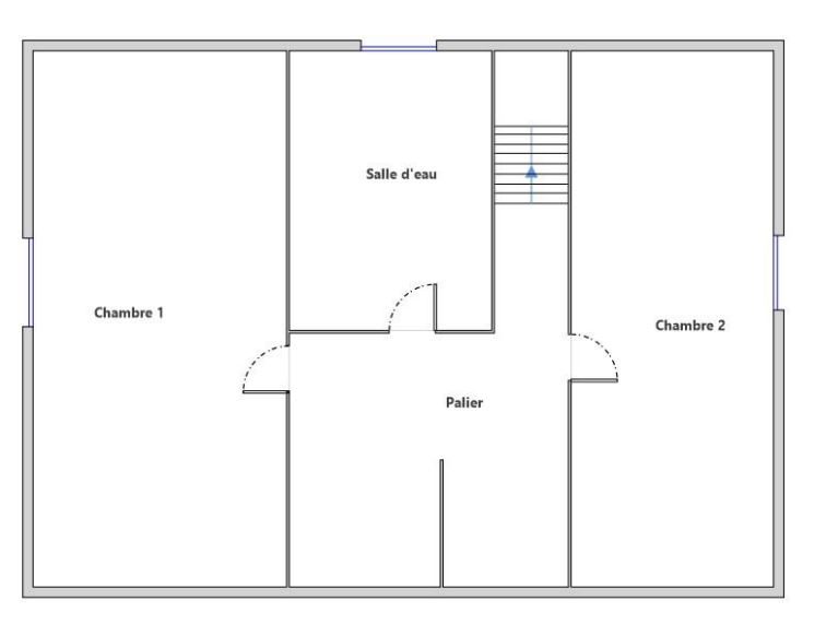 A l'étage : un couloir avec rangement dessert deux chambres et une salle de douche avec rangement.