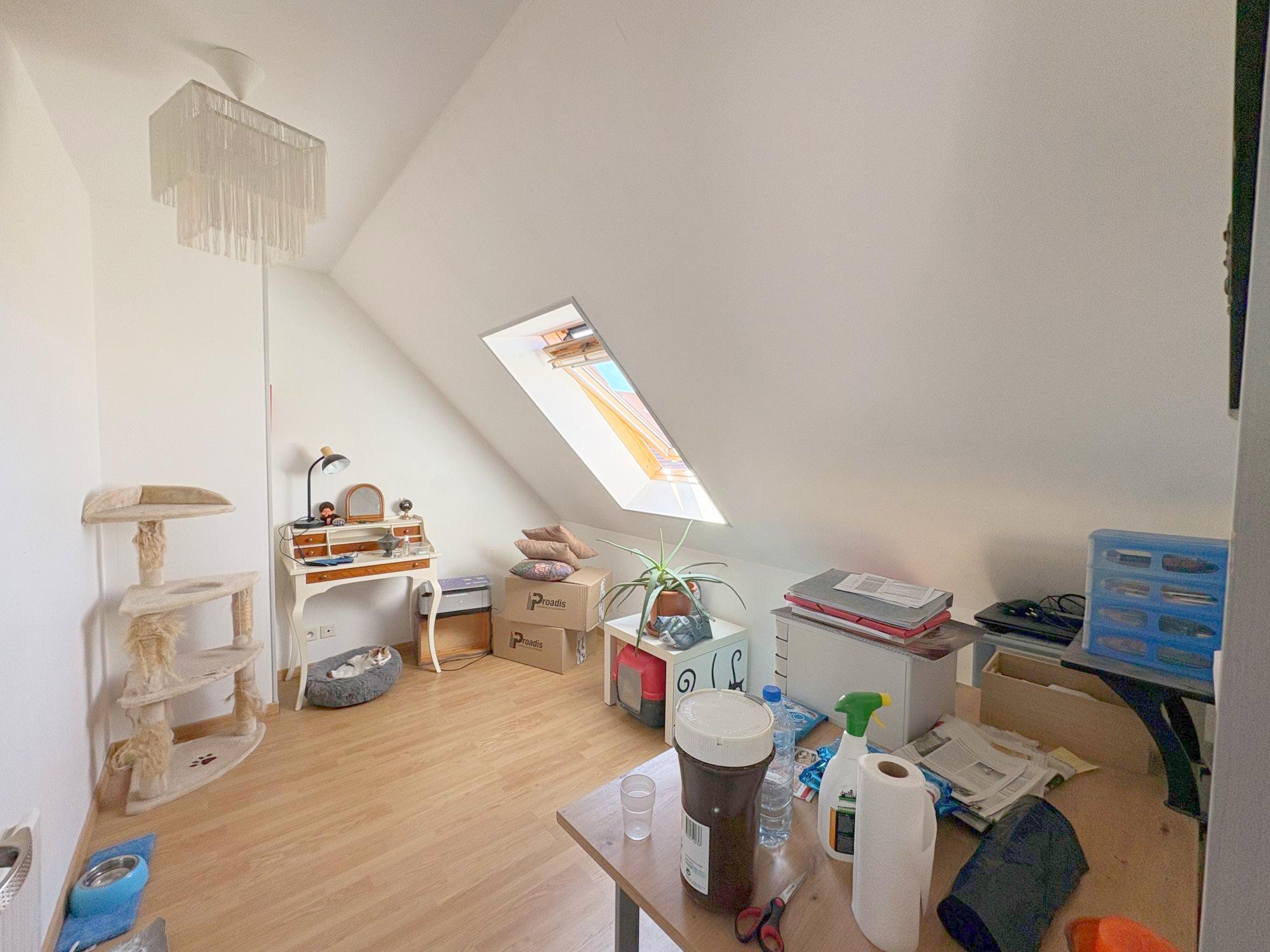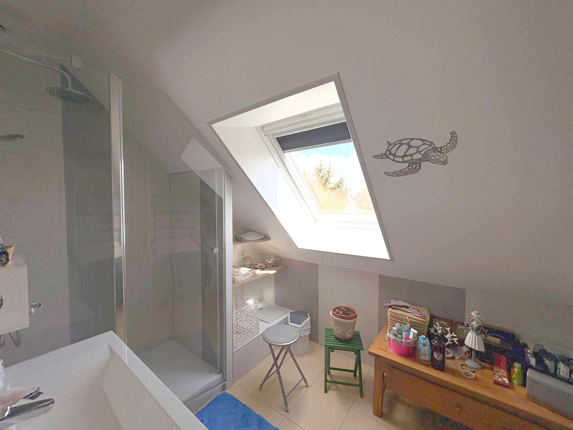 Au rez-de-chaussée : une entrée desservant l'escalier de l'étage, WC, un salon-séjour avec poêle à granulés ouvert sur une cuisine aménagée et équipée.