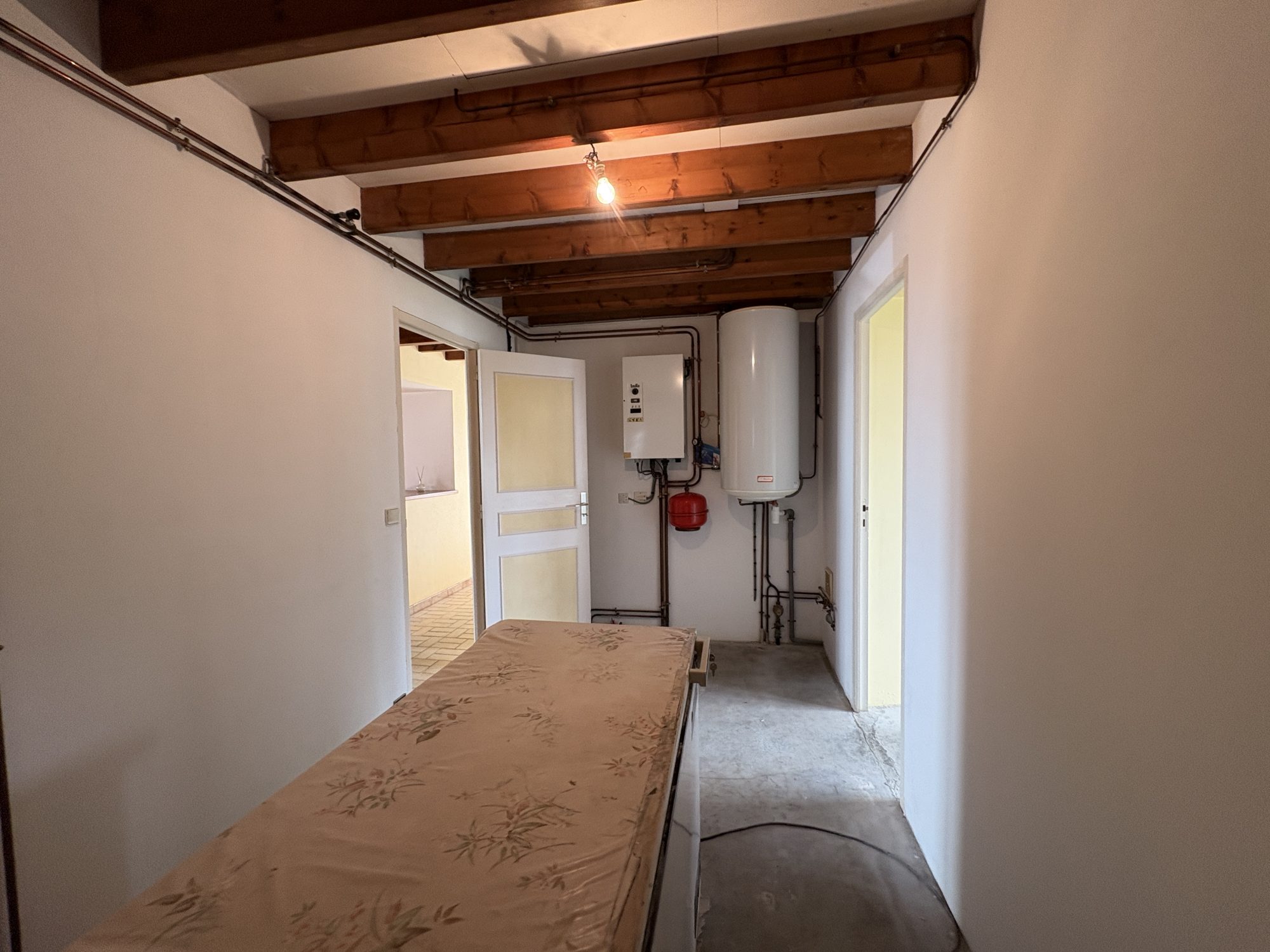 Maison avec de la pierre mitoyenne d'un coté, comprenant une entrée donnant sur une cuisine équipée et aménagée, une pièce de vie avec un insert, un couloir desservant un wc avec un lavabo, une buanderie et un garage.
