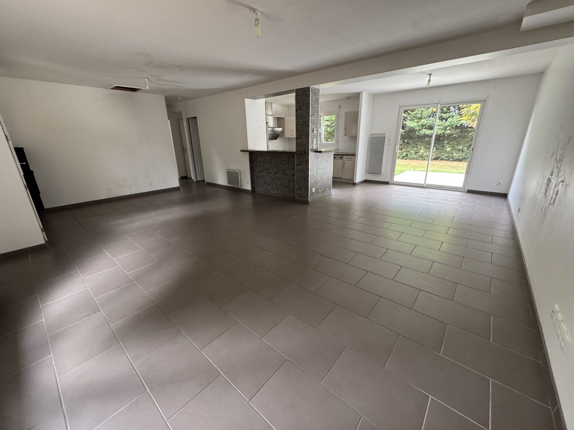 Pièce de vie avec cuisine aménagée ouverte (50m²), dégagement, 2 chambres, salle de bains, cellier et wc.