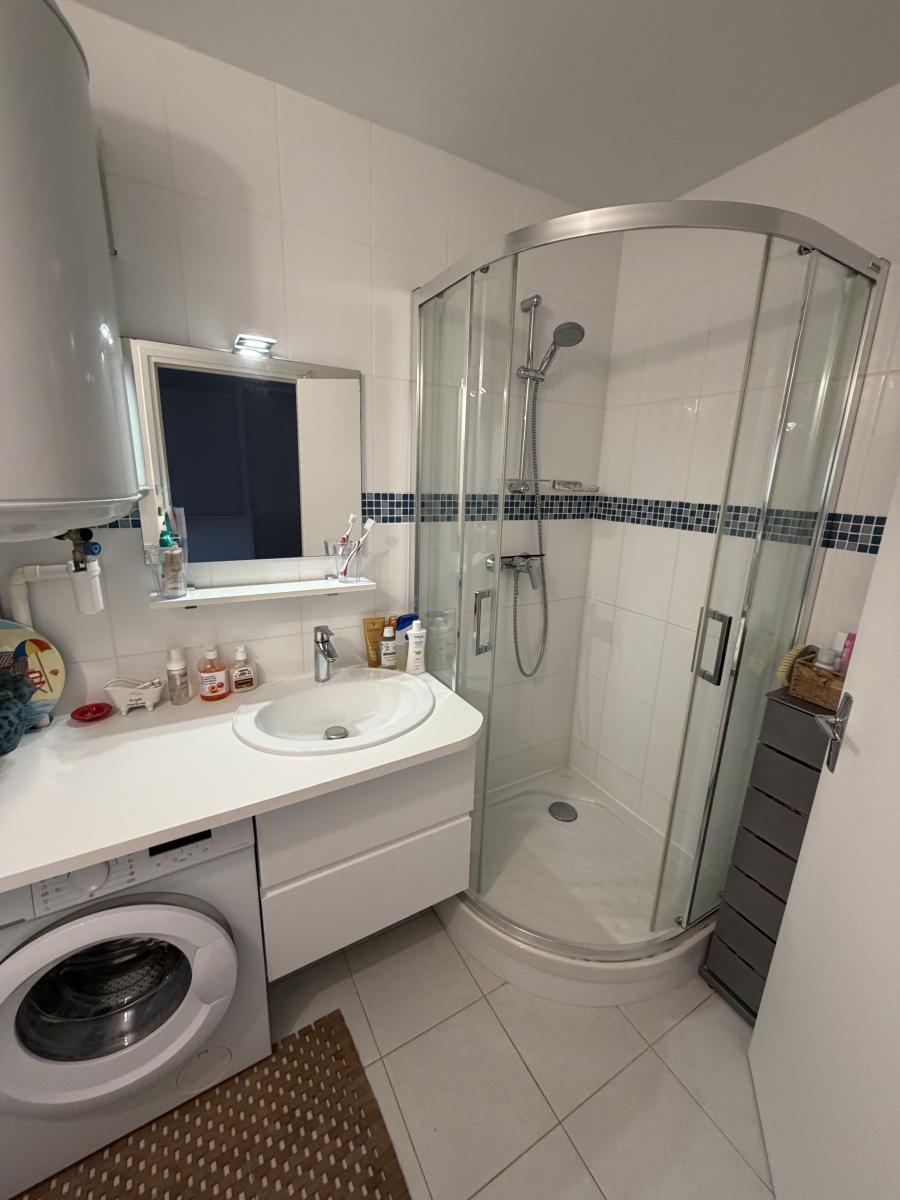 Entrée avec rangements, pièce à vivre, cuisine ouverte aménagée et équipée, terrasse exposée sud-ouest.