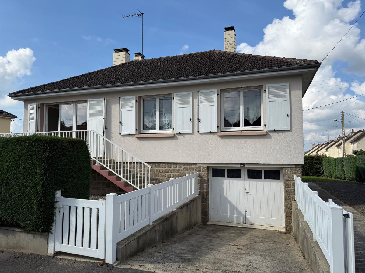 Proche commerces, Maison en bon état, comprenant : Sous-sol : une pièce, salle de bains/WC, pièce avec cheminée, garage ; Rez-de-chaussée surélevé : entrée, séjour salon (conduit de cheminée), cuisine, dégagement, deux chambres, salle d'eau, WC. Grenier. Cour et jardin.