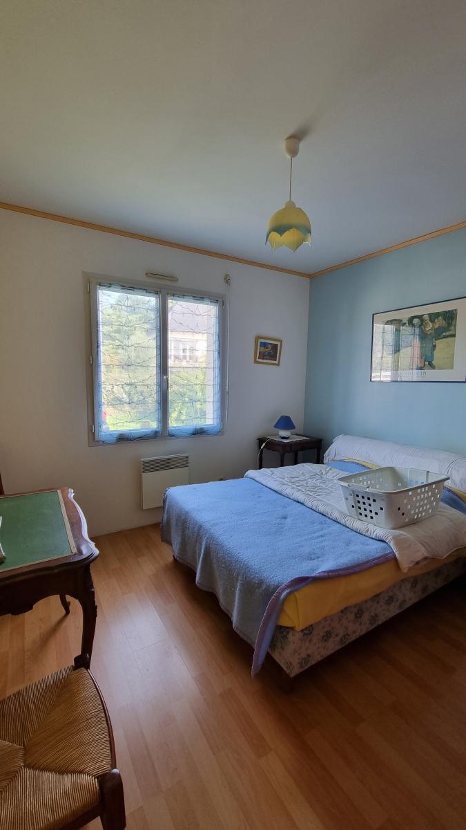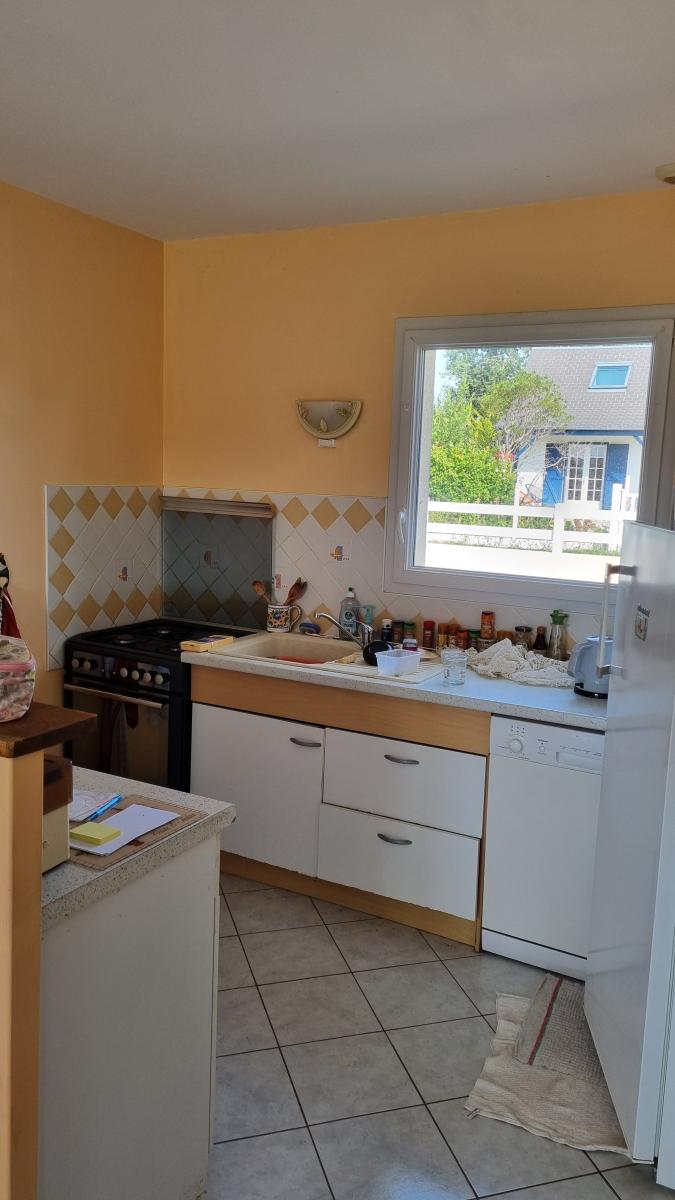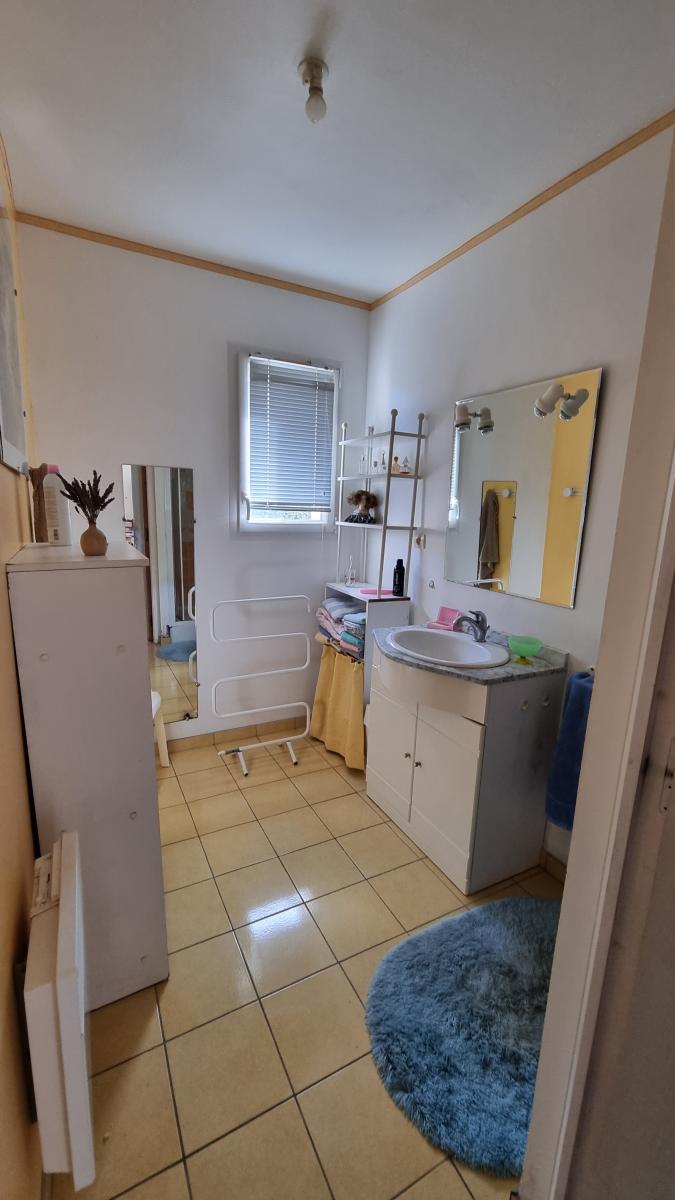 Entrée avec placards, wc avec lave-mains, cuisine ouverte sur le séjour/salon, salle d'eau, trois chambres.