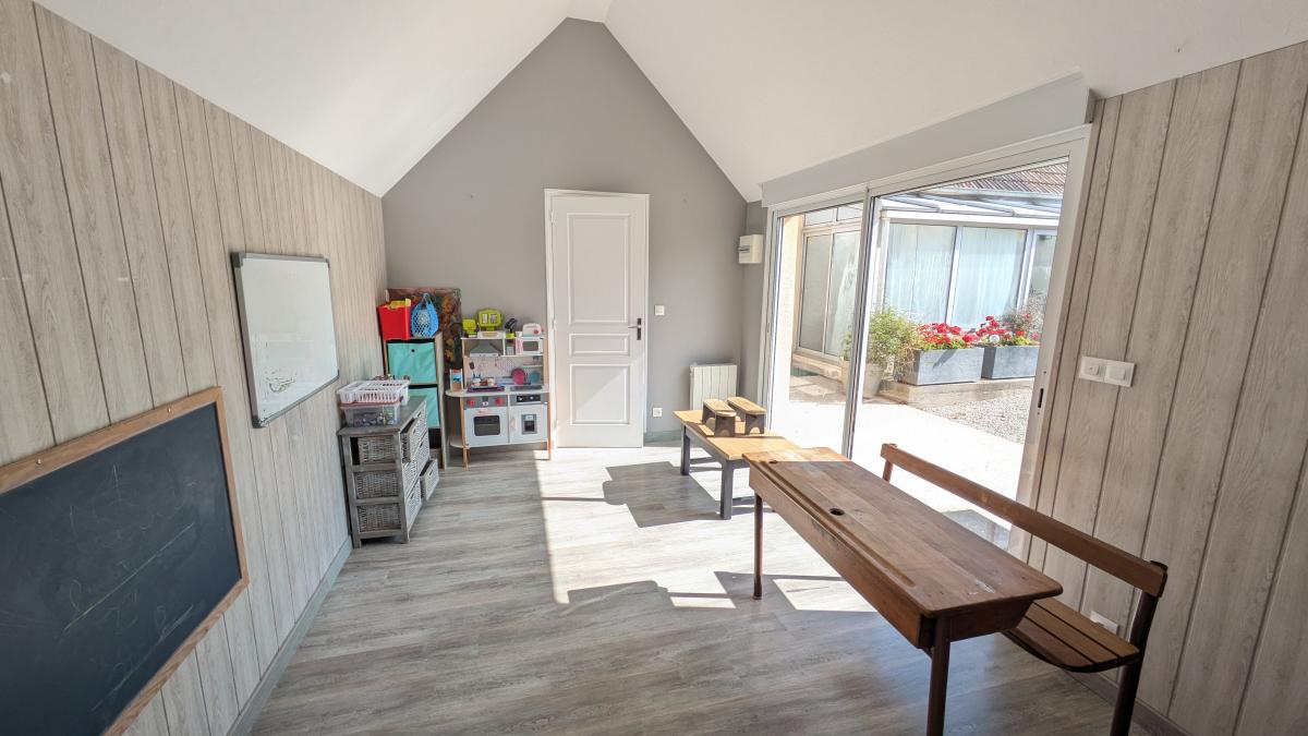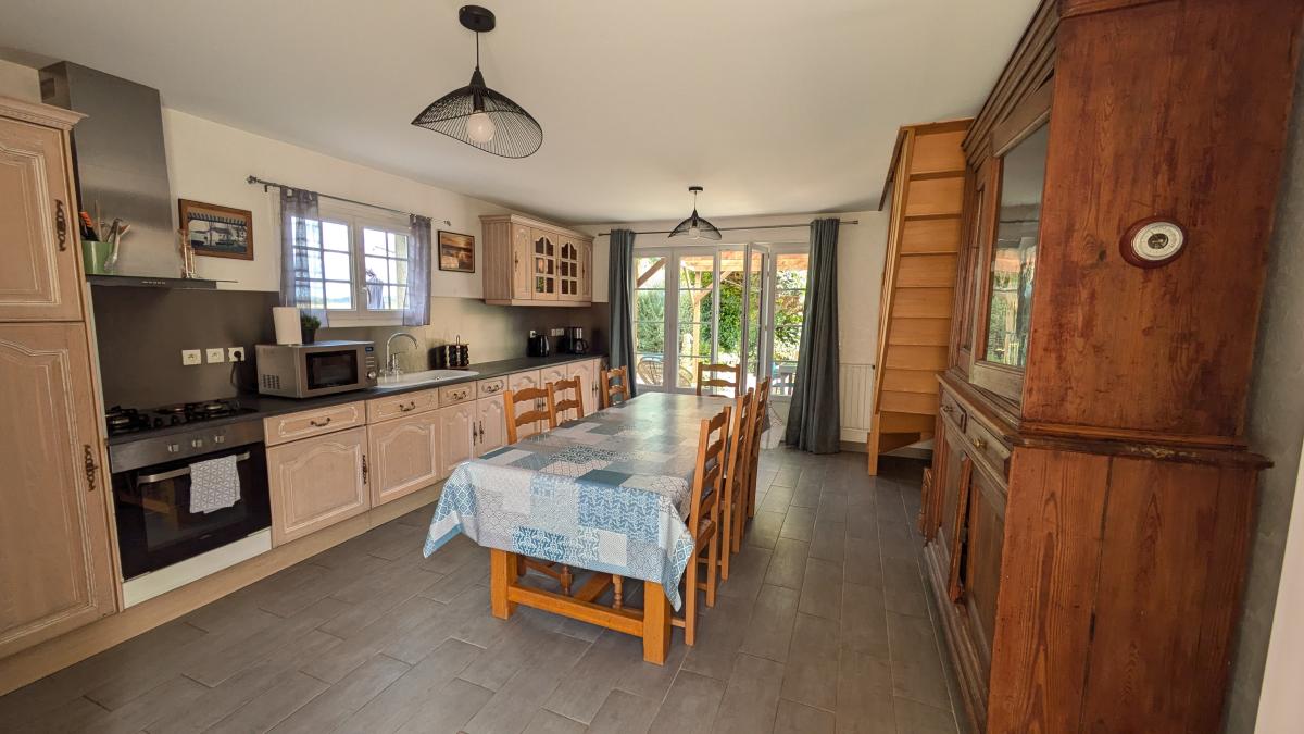 - Une grande cuisine aménagée et équipée, un salon avec une cheminée équipée d'un poêle à bois, salle d'eau, W.C. - Véranda - Au dessus : 2 chambres. - En perpendiculaire et de PLAN PIED : une salle de jeux, une chambre, une salle d'eau et un W.C.