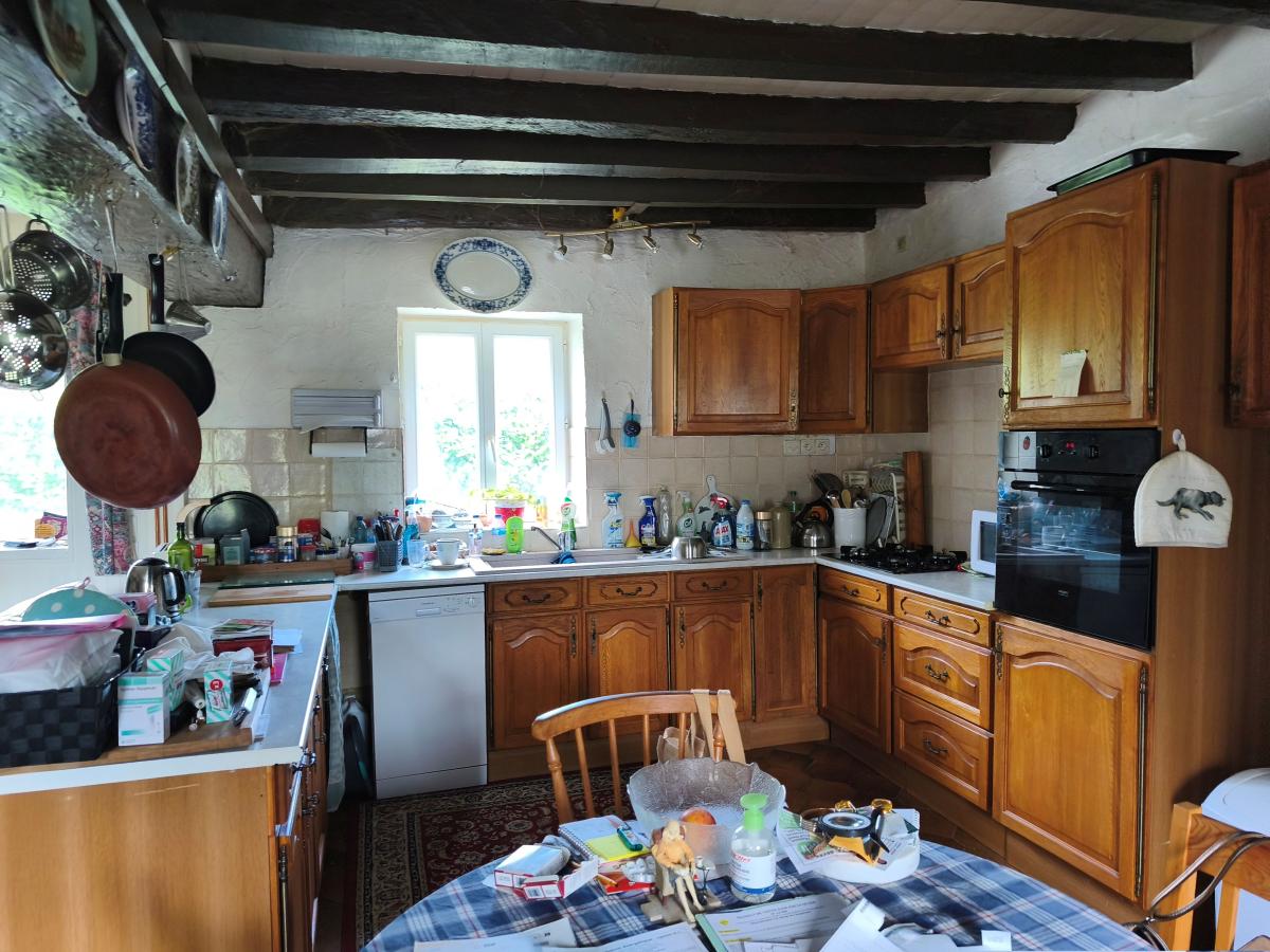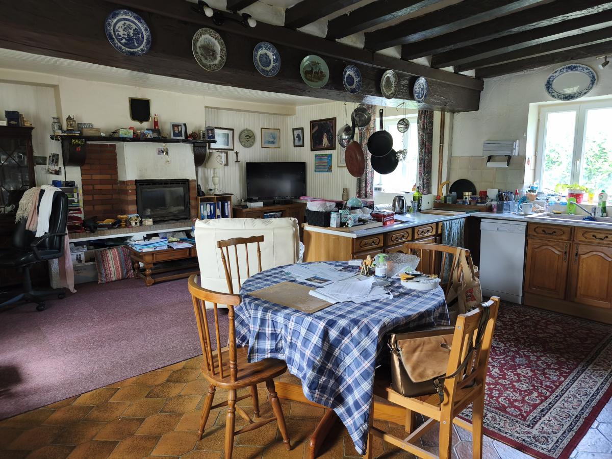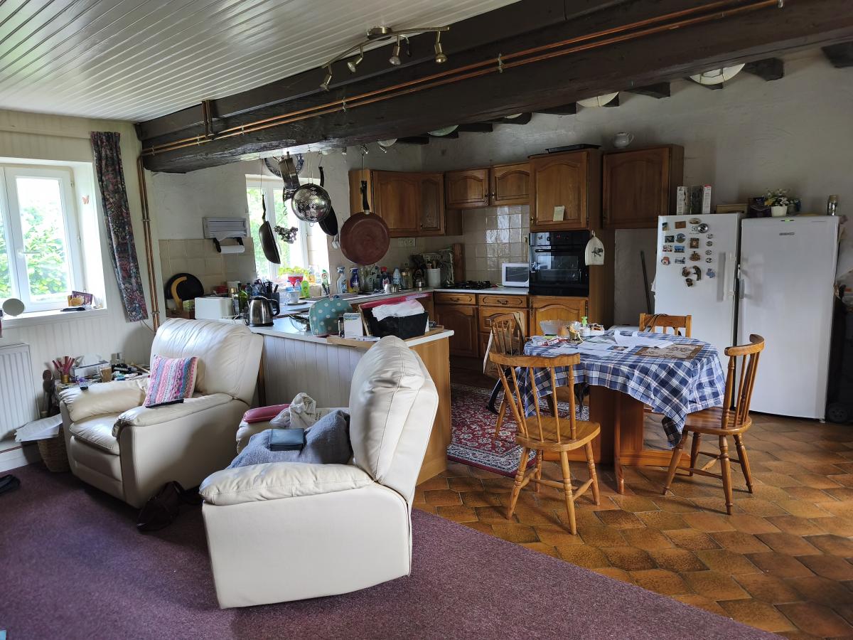 Dans hameau en campagne, maison de 4 pièces (55 m²) sur env. 700 m² de terrain. Le rez-de-chaussée comprend un séjour avec cuisine aménagée et insert, salle d'eau, wc, buanderie, Le 1er étage comprend 3 pièces dont une à usage de chambre. Cour et jardin, l'ensemble sur 700 m² de terrain environ. Chauffage central électrique. DPE : F.