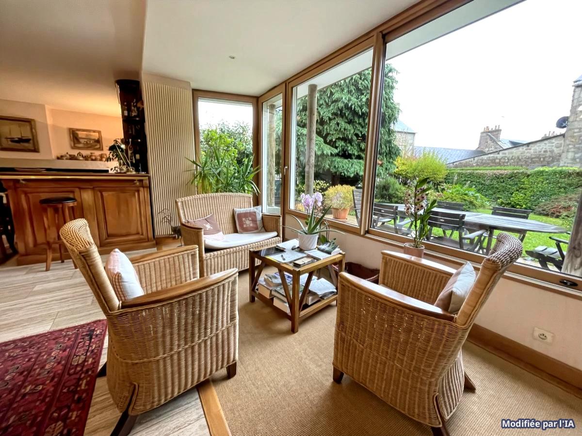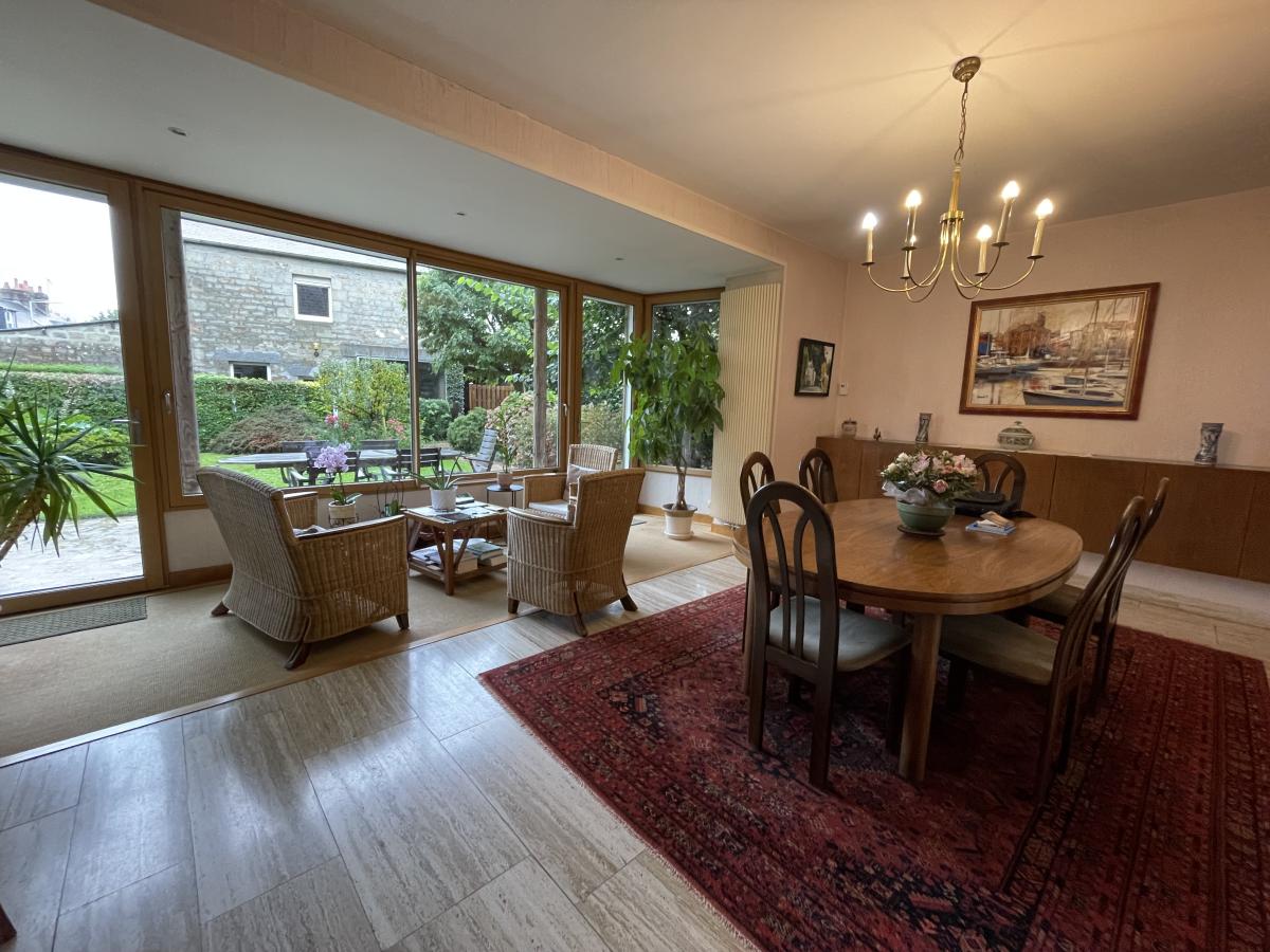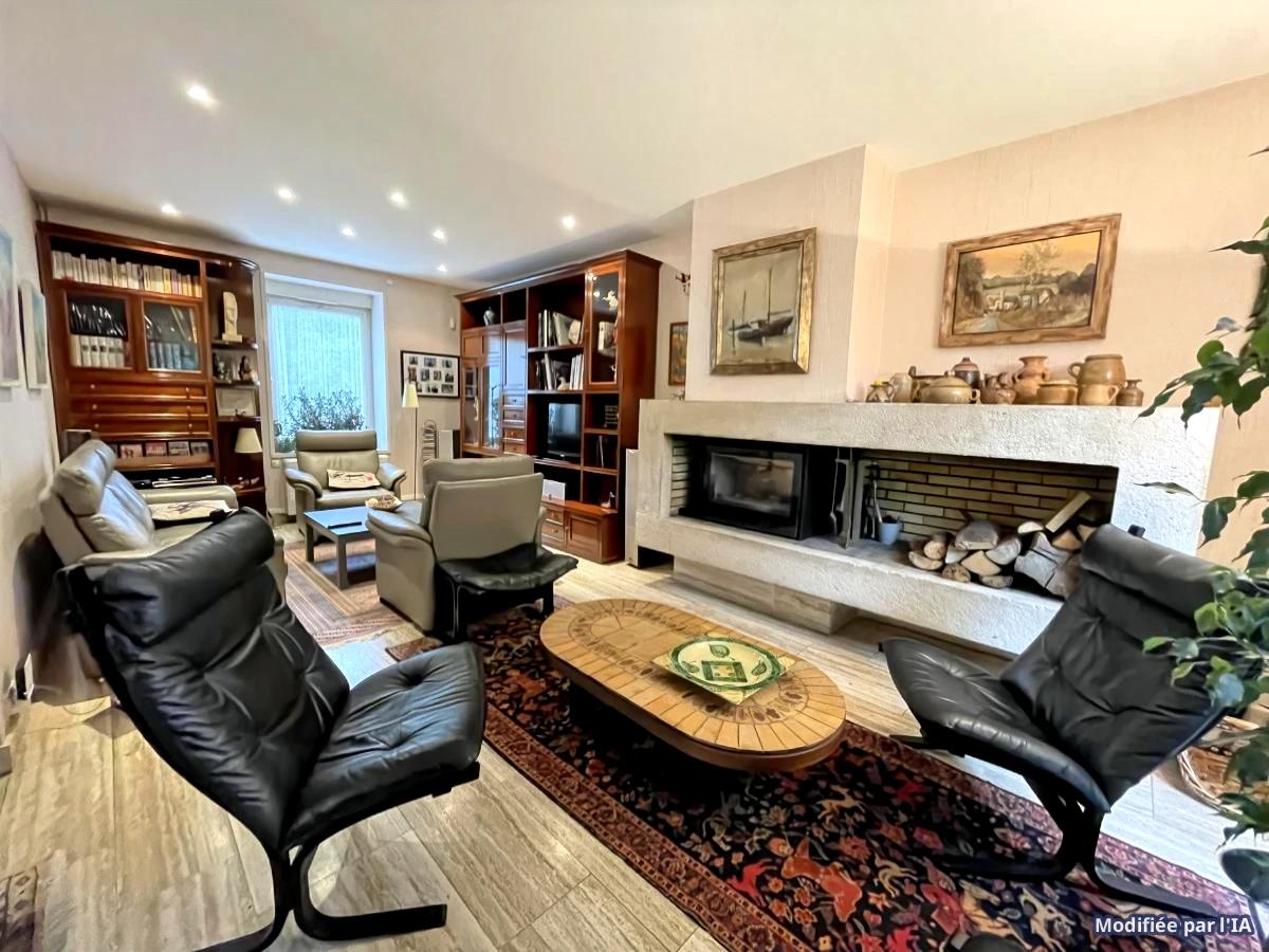 La maison principale comprend au RDC : entrée, séjour lumineux avec bow window donnant sur jardin arboré exposé sud, grand salon avec poêle à bois, cuisine équipée, dégagement avec placards, WC, cellier ; Au 1er étage : une partie parentale avec chambre, SDB, WC, bureau - une partie "enfants" composée de 3 chambres, douche, WC/lavabo ; Au 2ème étage : palier, grande pièce de jeux/salon, bureau, salle d'eau avec WC, autre pièce de 23 m² pouvant servir de chambre.