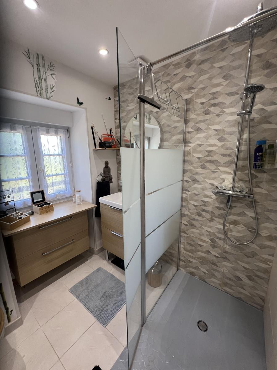 . Au RDC : entrée avec placard, cuisine équipée, séjour avec insert à granulés, chambre, salle d'eau/WC; buanderie, cave ;