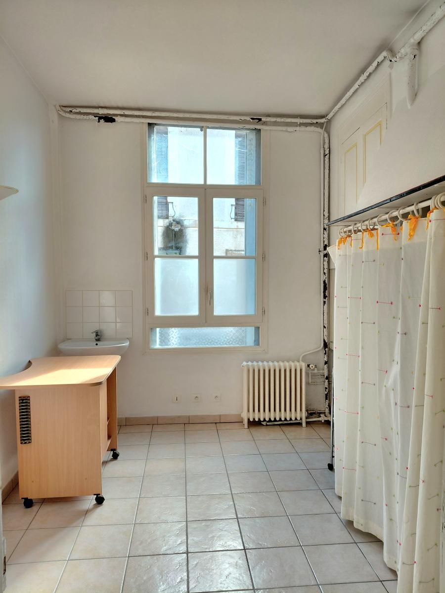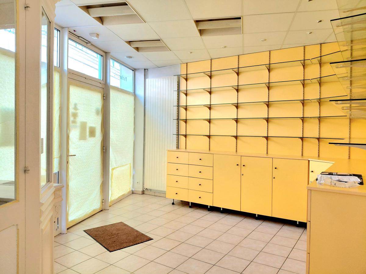 Rez-de-chaussée (env. 47 m²) : ancien local commercial pouvant être transformé en appartement de plain-pied, comprenant actuellement un espace principal, un sanitaire (douche), une pièce arrière et un bureau.