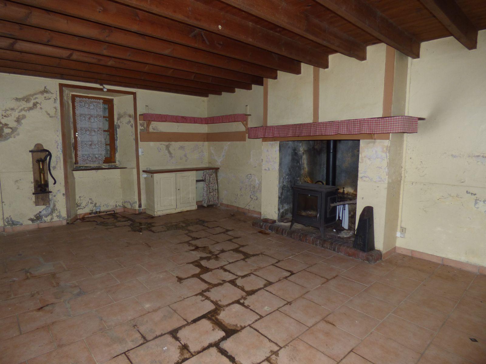 Au rez-de-chaussée : entrée, séjour avec poêle à bois, WC avec lavabo, cuisine, deux étables